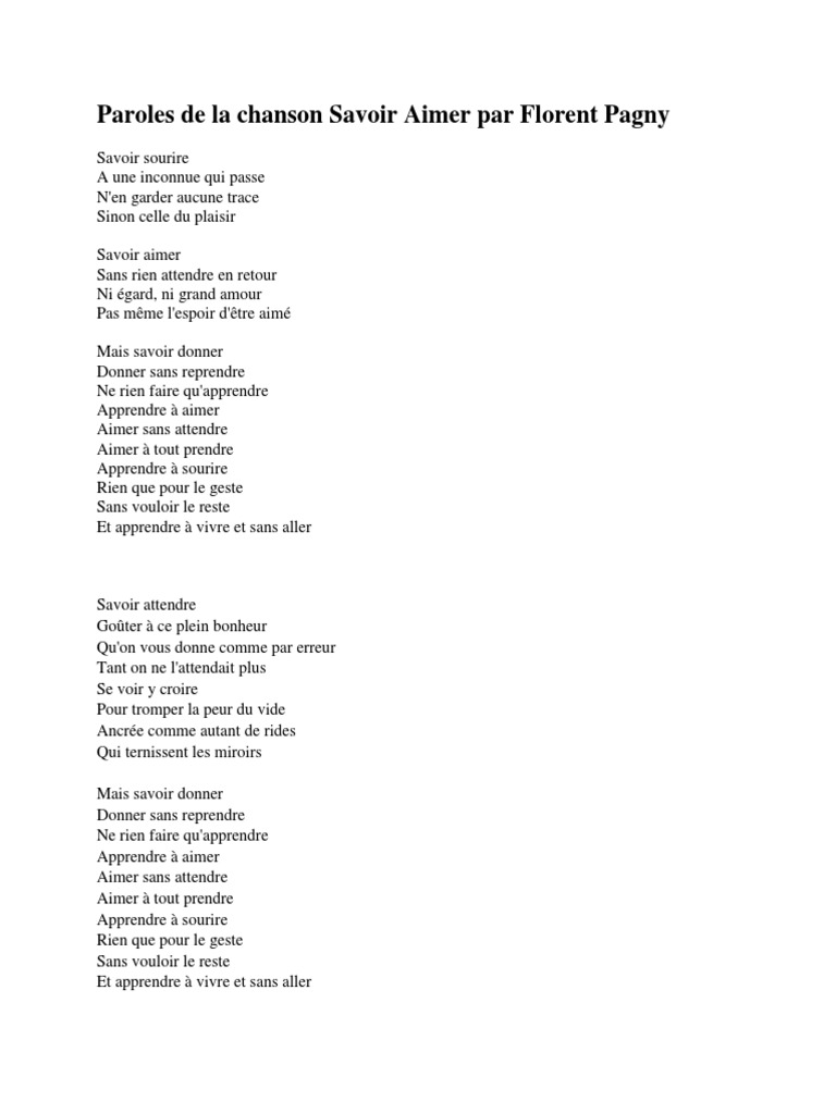 Sans rien attendre en retour florent pagny savoir aimer. (lionel florence/pascal obispo) savoir sourire a une inconnue qui passe n'en garder aucune trace sinon celle du plaisir savoir aimer sans rien attendre en retour ni espoir ni grand amour pas même l'espoir d'être aimé refrain.